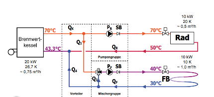Für eine Fußbodenheizung benötigt man eine geringe Vorlauftemperatur. Für eine Radiatoren oder Konvektorheizung wird üblicherweise eine höhere Vorlauftemperatur benötigt. Dies zusammenzubringen gelingt heute mit einer optimierten Rücklauftemperaturanhebung. Dadurch entnimmt man dem Rücklauf der Radiatorenheizung die Energie, die als Vorllauftemperatur der Fußbodenheizung zur Verfügung gestellt wird.